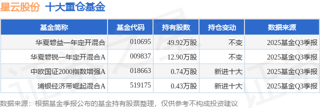 根据2025基金Q3季报公募基金重仓股数据,重仓该股的公募基金共4家,其中持有数量最多的公募基金为华夏基金的华夏磐益一年定开混合。华夏磐益一年定开混合目前规模为5.4亿元,最新净值1.4381(11月10日),较上一交易日下跌0.36%,近一年上涨24.97%。该公募基金现任基金经理为张城源。张城源在任的基金产品包括:华夏磐泰混合(LOF)A,管理时间为2016年12月26日至今,期间收益率为81.1%;华夏磐利一年定开混合A,管理时间为2020年7月29日至今,期间收益率为87.13%;华夏磐锐一年定开混合A,管理时间为2020年12月22日至今,期间收益率为77.93%;
