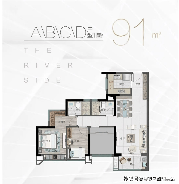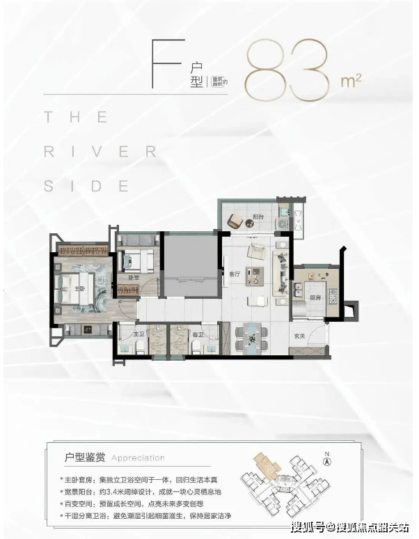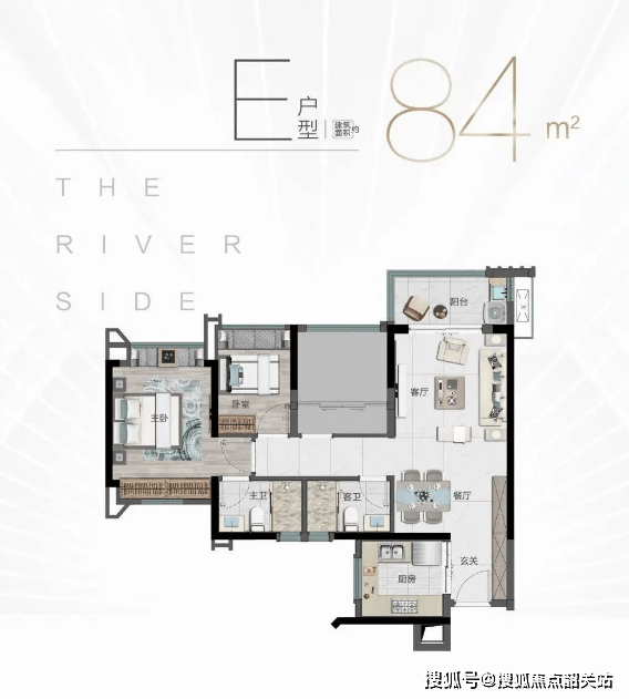 :该户型为刚需入门优选,建筑面积约83㎡,规划3室2厅1卫1阳台,整体户型方正,南北通透,空间利用率高,无浪费面积。布局上,客厅与阳台相连,阳台朝南,采光通风俱佳,客厅面宽约3.6米,空间宽敞,可满足家人日常休闲、会客需求;餐厅紧邻厨房,动线合理,方便上菜和用餐,厨房为L型设计,操作空间充足,预留了冰箱、洗衣机等家电位置,实用性强。三个卧室均朝南,采光充足,主卧面积约12㎡,配备飘窗,可作为休闲、储物空间,提升居住舒适度;两个次卧面积约8-9㎡,可作为儿童房、书房或客房,灵活适配家庭不同阶段的需求;卫生间为干湿分离设计,避免潮湿异味,使用更便捷,适合三口之家居住。